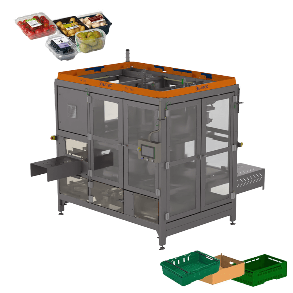 The Egatec packing machine PC242 has been developed for all types of food packages in trays that must be transported down into open plastic or cardboard boxes.